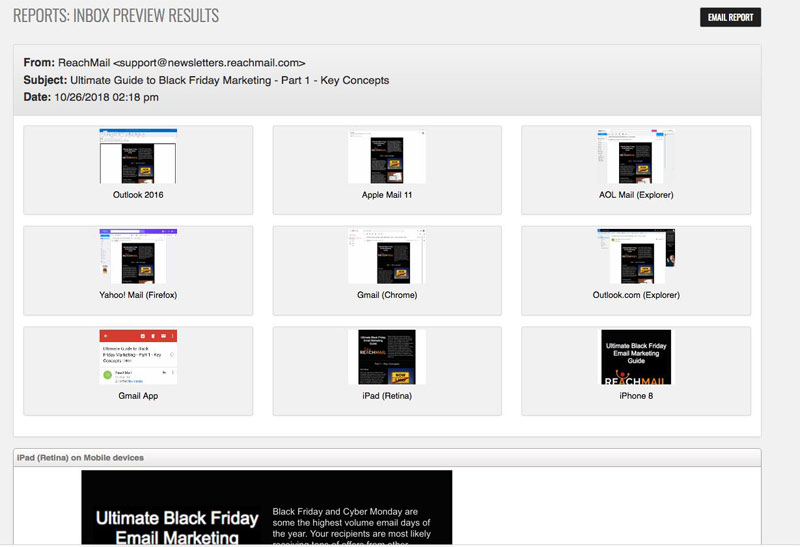 ReachMail integrates Inbox Previews from Litmus. Available to paid accounts, Inbox Previews show you what your message looks like in several email clients before you send.