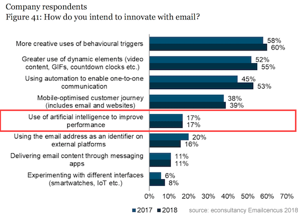 Personalisation is now a critical issue. And yet, email marketing often still operates with legacy technologies and segment-driven campaigns. According to E-consultancy, just 17% of brands and 21% of agencies are innovating with artificial intelligence to create personalisation at scale. So there are currently opportunities for marketers to differentiate themselves through an AI strategy.