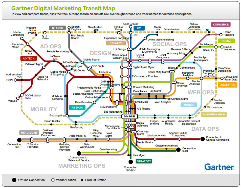 The modern consumer is 24/7 connected, across a broad spectrum of channels and expects relevance in every channel at every moment that he or she decides to interact with you. The Gartner Digital marketing transit map gives an idea of the channels marketers have to deal with these days.