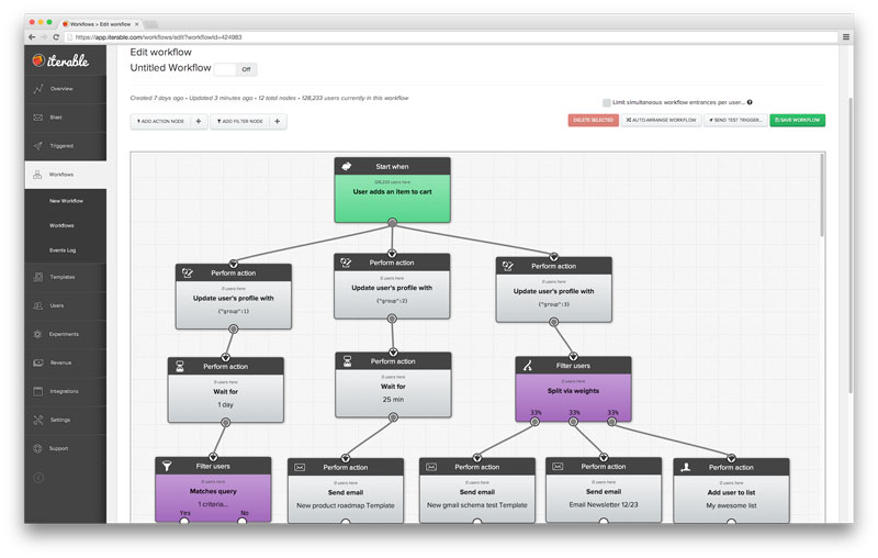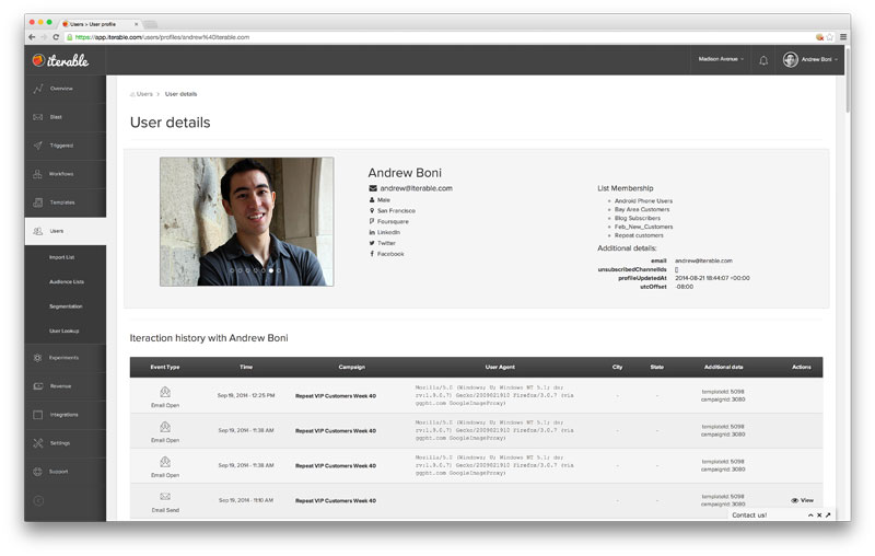 Iterable empowers growth marketers to create user engagement campaigns throughout the lifecycle, and across channels. Marketers segment users, build workflows, automate touchpoints, and test strategies without engineering support.