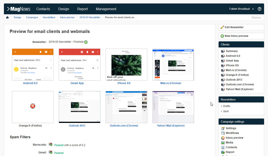 MagNews allows marketers to easily build and manage their email & mobile campaigns with a set of specific features: Advanced Database Segmentation, Drag & drop Editor, SMS Editor, Advanced Reports, Conversion tracking and Engagement Score, Survey tool, Spam & Errors check, Inbox Preview, Send time optimization, bounce management and more.