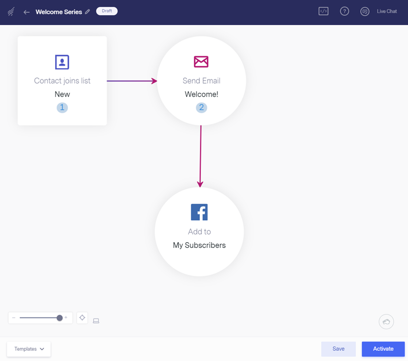 Select your trigger and action in a visual marketing automation builder to create email workflows based on your contacts’ behavior. Leverage website visits, email engagement, and contact lists to build powerful sequences.