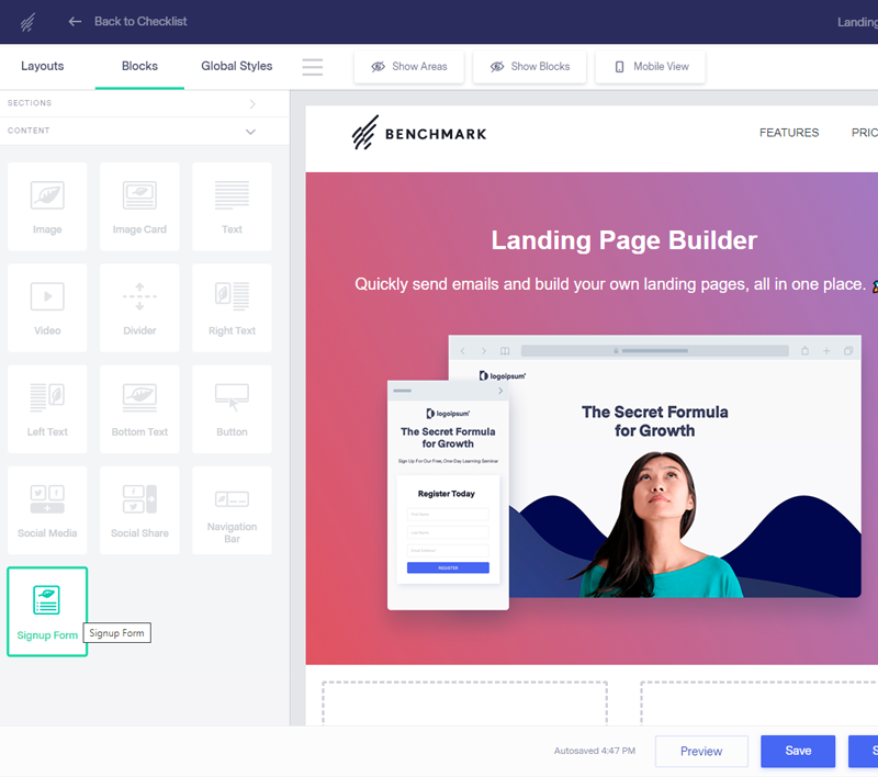 When it comes to growing a loyal audience, Benchmark has you covered with landing pages, online forms, pop-ups, surveys and polls. Automate personalized emails and campaigns with a visual marketing automation builder. Simple email tools make it easy for anyone to communicate with subscribers at scale.