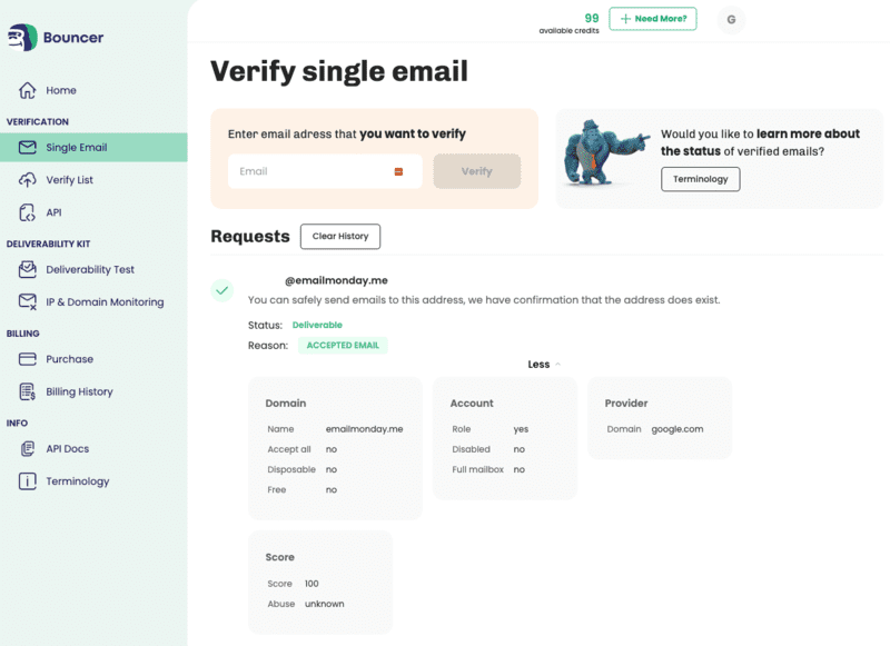 Integrations – Bouncer also provides smooth integrations with over 10 top marketing and cold mailing tools (like Moosend, Lemlist, Mailchimp), so you can verify your subscribers even quicker and smoother.