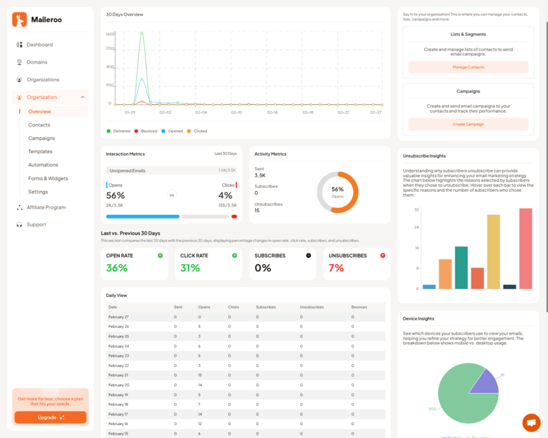 Maileroo makes collaboration easy with multi-user support, perfect for agencies managing multiple clients. With Maileroo, you can create separate accounts called ‘Organizations’ for each client, giving them access to their own campaigns and reports. Plus, you can set permissions to control what each user can do, making sure your clients’ data is secure.