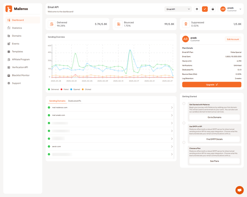 Maileroo is an email delivery provider, providing scalable delivery for both transactional and marketing emails. Designed for developers by developers, our SMTP / HTTP API makes it easy for your platform or application to send emails without all the complications. Maileroo includes tools for DNS diagnosis, suppression handling, blacklist monitoring, and isolated metrics per domain.