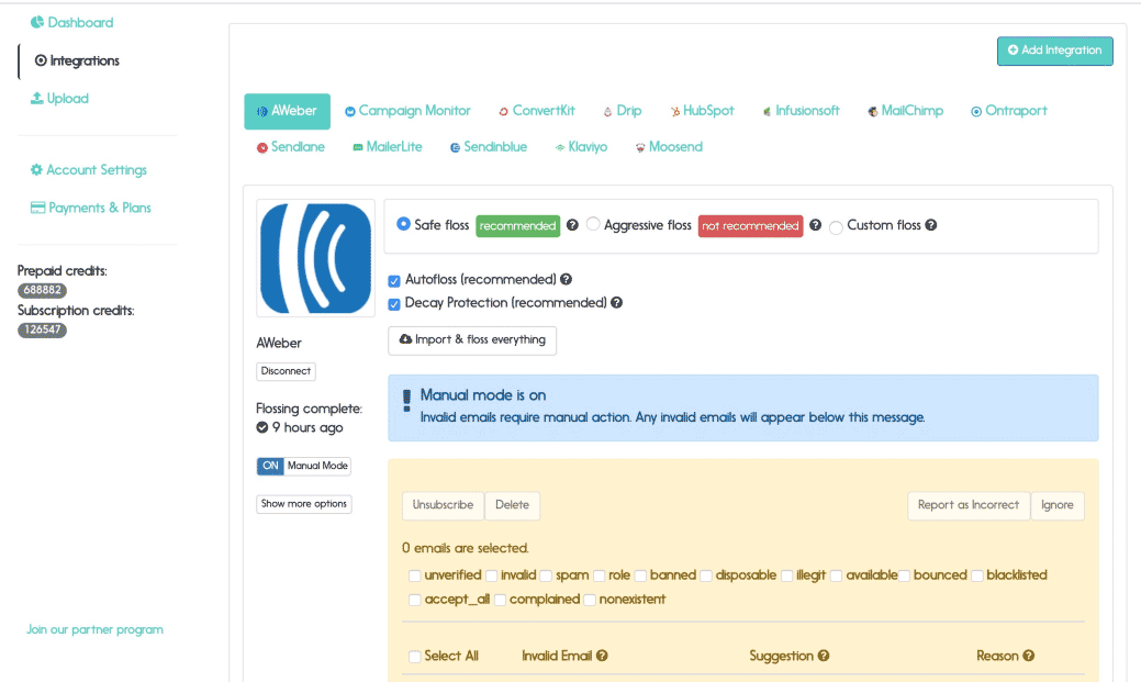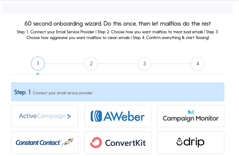 mailfloss is a hands-free bulk email verifier. Connect your email service provider, set some options, and that’s it. Setup is quick and you only have to do it once.