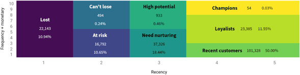 Here is an example of dashboarding that will allow you to develop specific client actions on customer RFM segments.