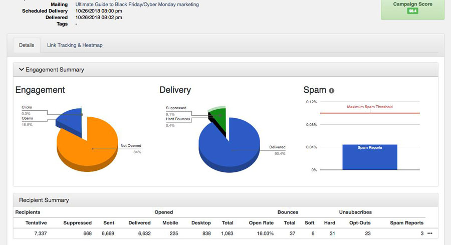 Access to openers, clicker data including timestamps, IP, browser data. Aggregate reporting as well and individual email campaign reporting.