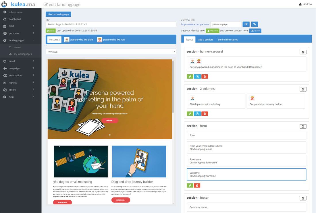 Kulea.ma is a low cost, modern SaaS Marketing Automation solution designed for use by SME’s. By reducing the cost of set up and use, and enhancing usability so that the tool is accessible to all, Kulea aims to enter a marketplace untapped by current solutions to become the default MA solution for small businesses.