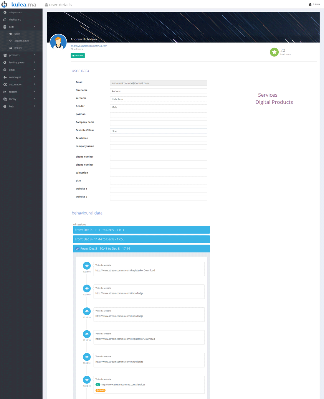 Kulea's integrated form builder and CRM help customer data to be up to date, whilst online tracking provides behavioural insight on customer activity, allowing sales teams to see what web pages, emails, brochures and videos their customers have been viewing online, and score leads accordingly to identify hot prospects.