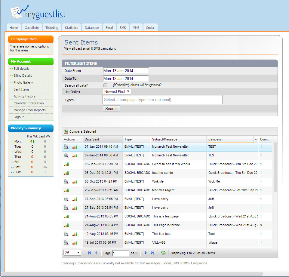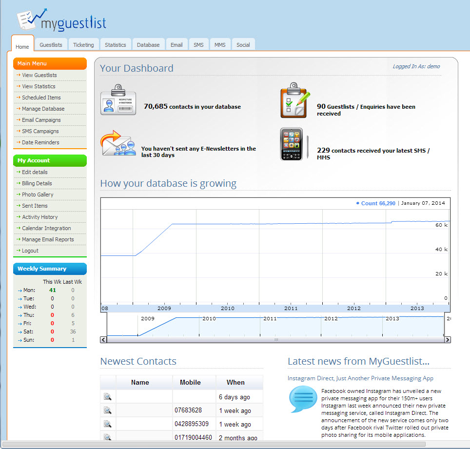 The online tool is specifically designed for Nightclubs, Bars, Promoters, Restaurants, Pubs & Event Organizers and manages your guestlists and events, even from a tablet, allows you to grow your database in over 10 different ways.MyGuestlist marketing software sends targeted E-Newsletters & SMS as well as links in to Facebook and other major Social Networks to see upcoming birthdays of friends-of-friends and target them based on age, gender and date of birth for example.