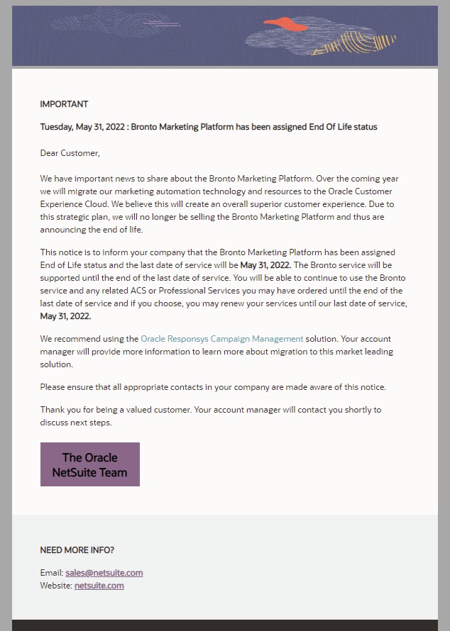 This week Oracle announced that the Bronto Marketing Platform has been assigned End of Live status. The last date of service will be May 31, 2022. This was all done via this announcement email. Some of the Bronto clients I have talked to were indeed shocked. And found it to be quite cold, and rude.