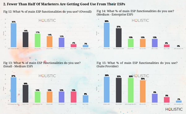 - Suite users are less likely to use half or more of the tools and features in their marketing suite. 27% of medium-size to enterprise-level ESPs said they use 60% or more of the tools in their platform compared with 22% of suite users.