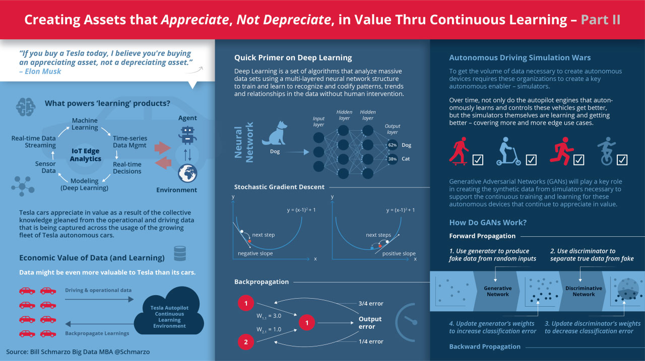 ![]() | Bill Schmarzo, Chief Innovation Officer, Hitachi Vantara:A significant business opportunity over the next 2 to 3 years will be in Artificial Intelligence and Deep Learning with IoT sensors to create “autonomous” products or assets that self-monitor, self-diagnose and self-heal without human intervention. And with AI and Reinforcement Learning, these products or assets will continue to get smarter through usage, resulting in assets that actually appreciate, not depreciate, through usage. While the autonomous cars are getting all the press, the creation of autonomous cars is a very difficult challenge given the highly unpredictable environment in which cars operate. There are easier places to start one’s autonomous assets or product journey including warehouse and factory robots, and construction and farming equipment. People can turn over parts of their everyday life to autonomous devices. This very well may be the first challenge for marketing in the new AI world. How organizations market these new autonomous product capabilities create a significant cultural challenge as organizations seek to convince their customers – through statistics as well as emotional imaginary. Companies (even if not producing AI products themselves) will need to adapt to new channels, touchpoints, and way of life. Hands-on Tip: Focus on meaningful business problemsMy tip is to start small and focus on a meaningful business problem (improving customer retention, improving cross-sell, reducing unplanned operational downtime, reducing inventory costs). Then to drive collaboration between business stakeholders (who can identify, validate, value and prioritize the organization’s key operational decisions) and the data science team (who can determine what advanced analytic capabilities to apply to that business problem). The opportunity to monetize one’s data – an asset that never wears out, never depletes and can be used across an unlimited number of use cases – is NOT a technology conversation; it’s an economics conversation. |