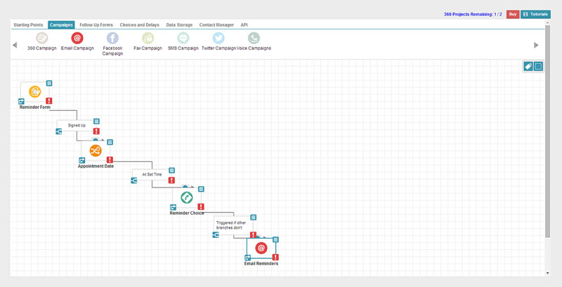 The 360 Customer Flow Communication platform enables businesses and organizations of all sizes to automatically send personally targeted campaigns to each of their unique contacts. The marketing suite of tools includes email marketing and autoresponder, a contact management, live chat, fax marketing, SMS marketing, voicemail, form builder, online survey, event management, Facebook and Twitter management, landing page generator, web tracking and blacklist monitor.