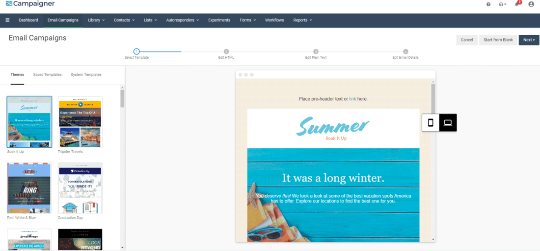 Campaigner provides all the tools you need to build email campaigns using its visual email builder and simple-to-navigate dashboard. You can choose from hundreds of responsive templates to create attractive emails. Also, you can build SMS campaigns – either standalone or incorporate them into your email automation workflows.