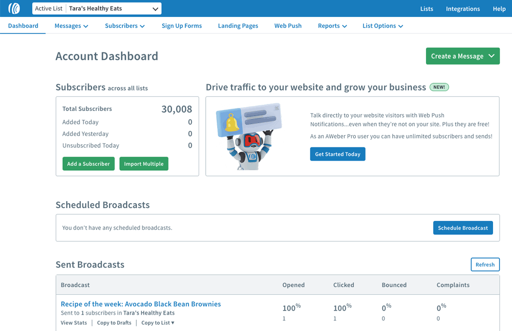 AWeber offers a free plan with 500 subscribers and 3,000 emails per month. The free plan also gives you access to most of AWeber’s features, including 1 landing page, sign-up forms, 1 automated email campaign, hundreds of powerful integrations, and its 24/7 award-winning customer support.