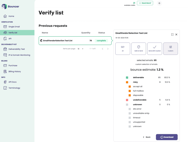allows you to test the quality of your list, completely free of charge! Based on a randomly selected sample of your list, Bouncer will tell you if your list needs cleaning. Saves both, time and cost!