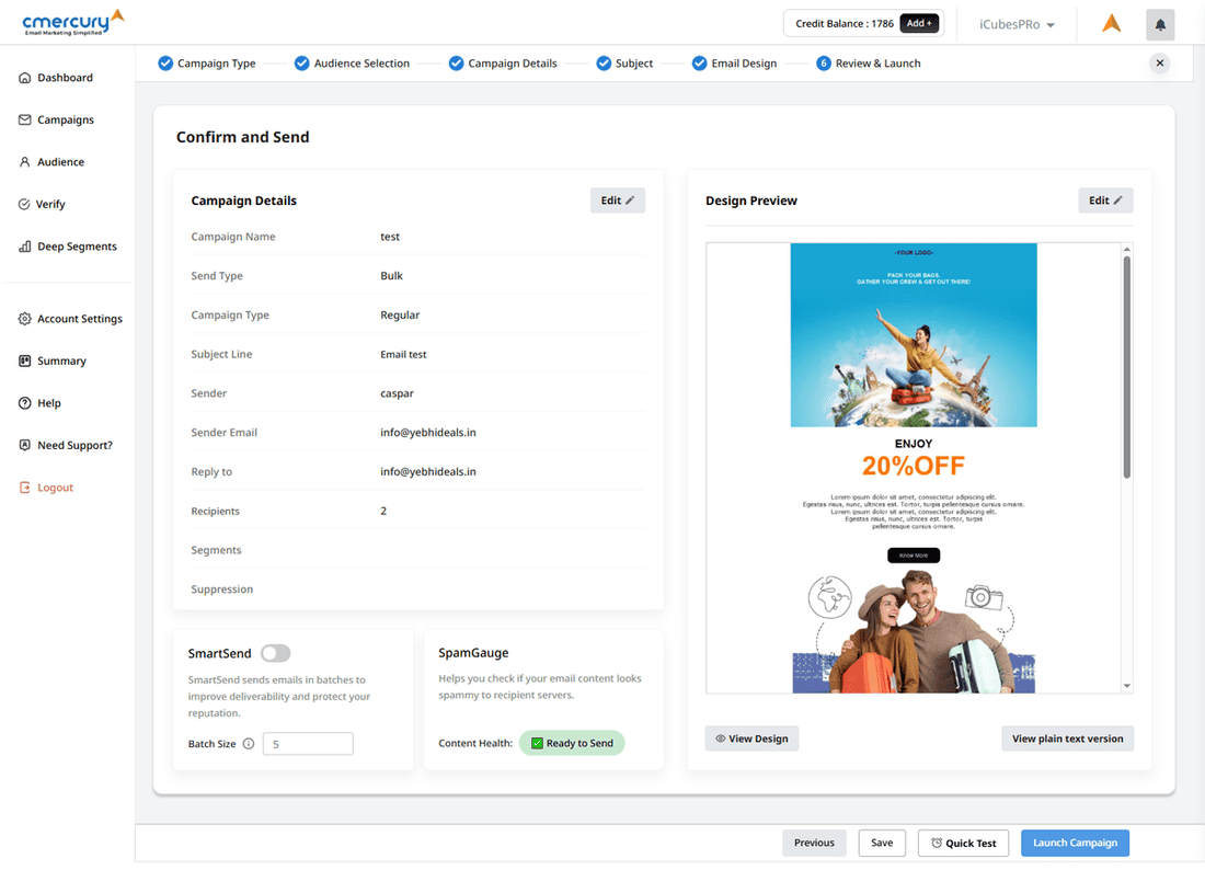 - SmartSend (Batch Scheduling) – Sends campaigns in controlled batches over defined time windows to reduce sending spikes and improve deliverability.