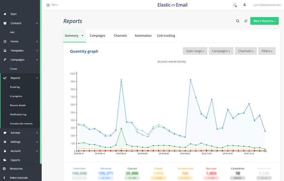- Surveys – create and send link to any survey created using Elastic Email. Survey results are automatically summarized and a report can be exported