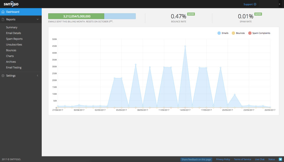 SMTP2GO has been providing outgoing email services to thousands of customers for over 10 years. Customers range from micro-businesses, sending a few hundred emails per month, to medium-sized businesses sending over 30 million emails per month.