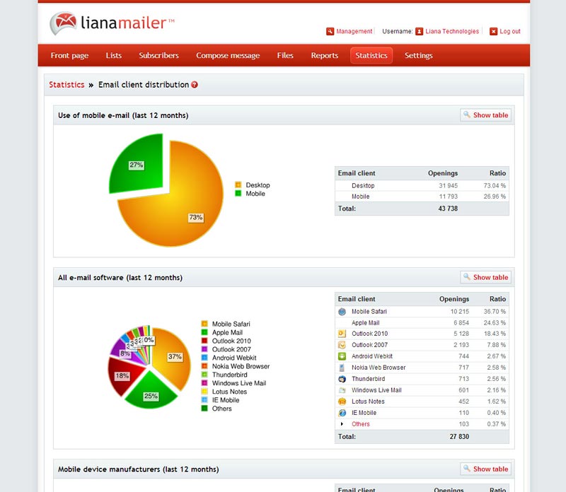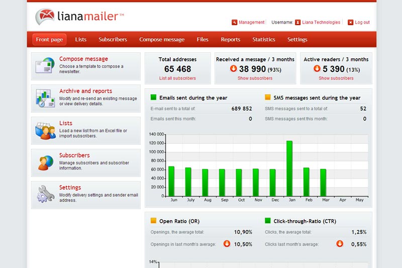 LianaMailer is a tool for email marketing and creating graphic newsletters with customizable look and feel for each company. The tool is used both by small companies as well as large corporations.