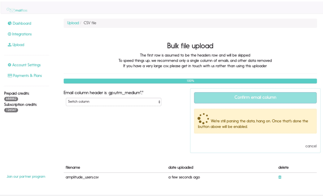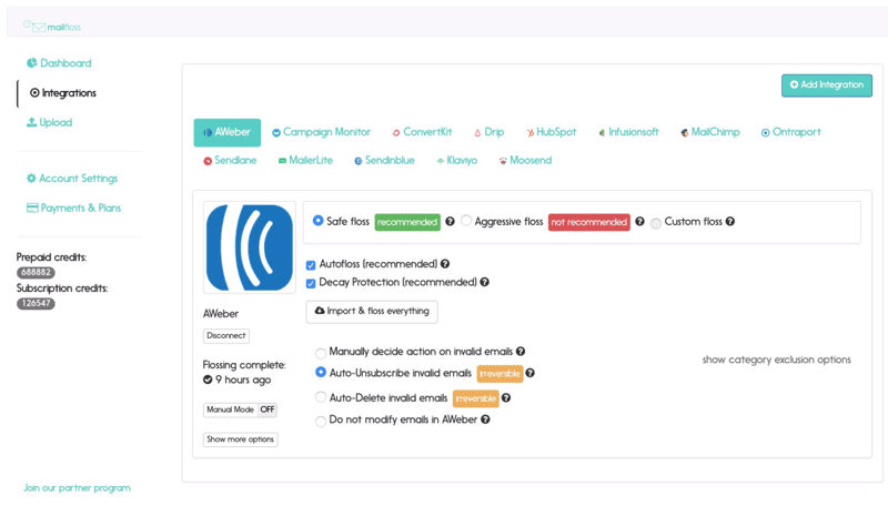 mailfloss is a hands-free bulk email verifier. Connect your email service provider, set some options, and that’s it. Setup is quick and you only have to do it once.